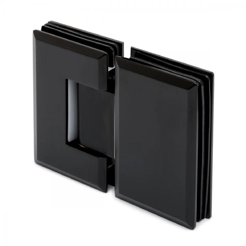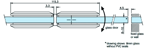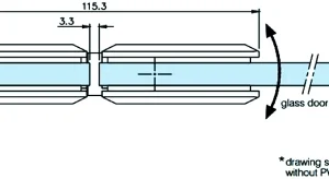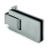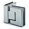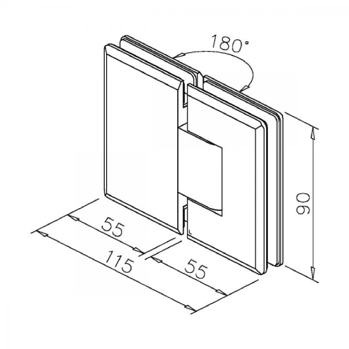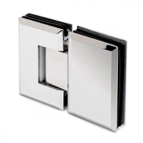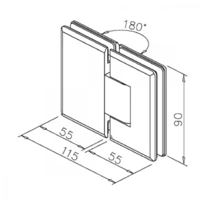 L’attacco vetro–vetro a 180° consente configurazioni lineari tra i pannelli. Il meccanismo a scatto con perno di rotazione +90°/−90° permette il posizionamento controllato dell’anta nelle posizioni di fine corsa, assicurando stabilità e precisione durante l’apertura e la chiusura.