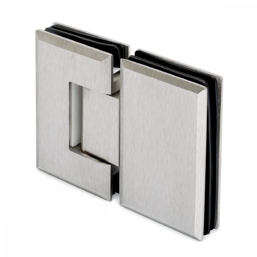 La cerniera a scatto vetro–vetro modello 01-231 è realizzata in acciaio inox AISI 304 ed è progettata per il collegamento diretto tra due lastre di vetro in ante battenti per box doccia.