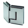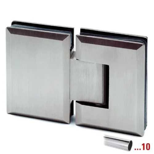 01-131 Cerniera a scatto vetro–vetro con attacco 180° in acciaio inox AISI 304 – Vetro 8–12 mm – Perno di rotazione +90°/−90° – Portata max 40 kg