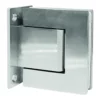Cerniera regolabile a scatto vetro–vetro con attacco 180° in acciaio inox, finitura satinata. Vetro 8–12 mm, perno +90°/−90°, portata max anta 50 kg, regolazione del punto 0 per fuori squadra.