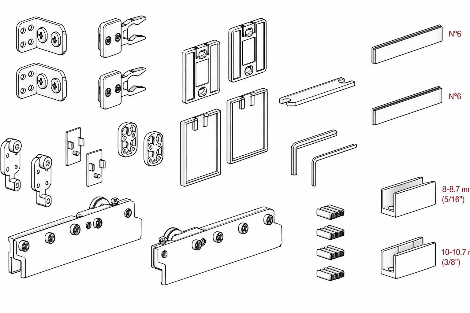 Il sistema è idoneo per configurazioni parete–parete, vetro–parete e vetro–vetro, offrendo massima flessibilità progettuale sia in ambito residenziale che professionale. I componenti sono studiati per assicurare un montaggio preciso e un funzionamento regolare nel tempo.