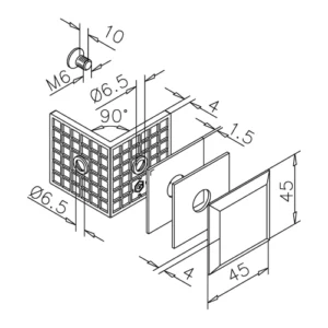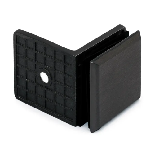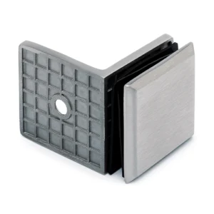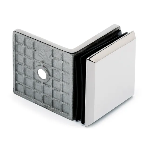 La configurazione a 90° consente un collegamento angolare solido e preciso tra vetro e muro, garantendo stabilità strutturale e continuità estetica. Il sistema di serraggio è studiato per assicurare un fissaggio stabile e una corretta distribuzione delle sollecitazioni sul vetro.